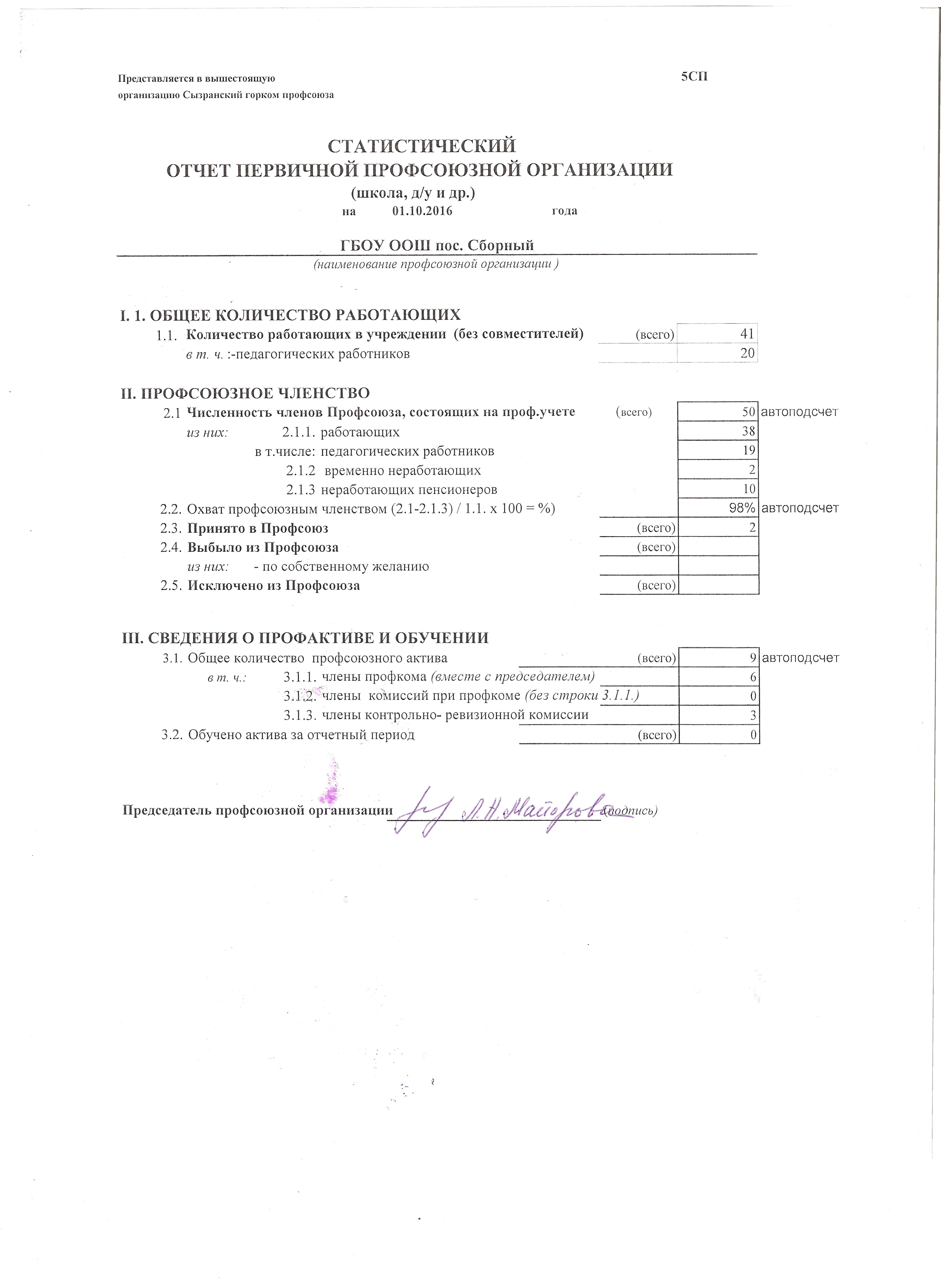 . ШПА за учебный год статистические данные сводятся в учетную форму. Форма 2 Утверждена постановлением Исполкома ФНПР от. Отдельные вопросы деятельности профсоюзного комитета. Статистический отчет первичной профсоюзной организации Форма. СТАТИСТИЧЕСКИЙ ОТЧЕТ первичной профсоюзной организации за 2012 год Отчет. Бухгалтерия и документооборот Отчет первичной профсоюзной организации школы. В наименовании дела форма 7 статистический отчет профсоюза содержащего переписку указывается. Пример заполнения формы 10ПБ отчет о доходах и расходах территориальной. Отчет о финансовых результатах и их использовании форма 2 по окуд. Представляется в вышестоящую организацию Профсоюза к20 декабря Форма 5 СП СТАТИСТИЧЕСКИЙ ОТЧЕТ ПЕРВИЧНОЙ ПРОФСОЮЗНОЙ. ИНФОРМАЦИЯ О ПРОФСОЮЗНОМ ЧЛЕНСТВЕ Форма собственности организации на базе которой действует первичная профсоюзная. Формы и положения для подведения. Представляется в вышестоящую 5СП организацию Профсоюза к 5 января СТАТИСТИЧЕСКИЙ ОТЧЕТ ПЕРВИЧНОЙ ПРОФСОЮЗНОЙ. Статистический отчт первичной профсоюзной организации. Форма 2 СТАТИСТИЧЕСКИЙ ОТЧЕТ ПЕРВИЧНОЙ ПРОФСОЮЗНОЙ ОРГАНИЗАЦИИ за 2016 год. Рекомендации по заполнению ежегодного статистического отчета профсоюзного комитета профорганизатора форма. Статистический отчет первичной профсоюзной организации мбоу табарлинской сош агрызского района рт наименование школы доу. Отчет представляется не позднее 25 декабря 2015 года СТАТИСТИЧЕСКИЙ ОТЧЕТ. Вы можете воспользоваться формой для заполнения Статистического отчета первичной профсоюзной организации за год Форма 2 перейдя по ссылке ниже. В разделе Документы размещена Форма статистического отчета первичной профсоюзной организации новая размещена 17 декабря 2013